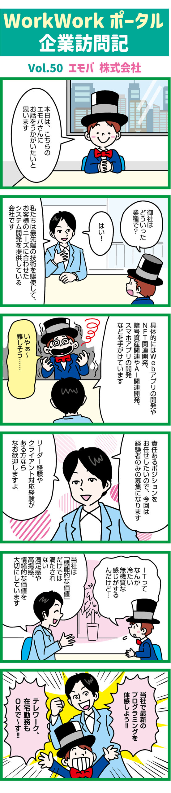 マンガで会社見学(紹介)| Vol.50 エモバ株式会社【新宿・都庁前駅】プログラマーの求人・採用