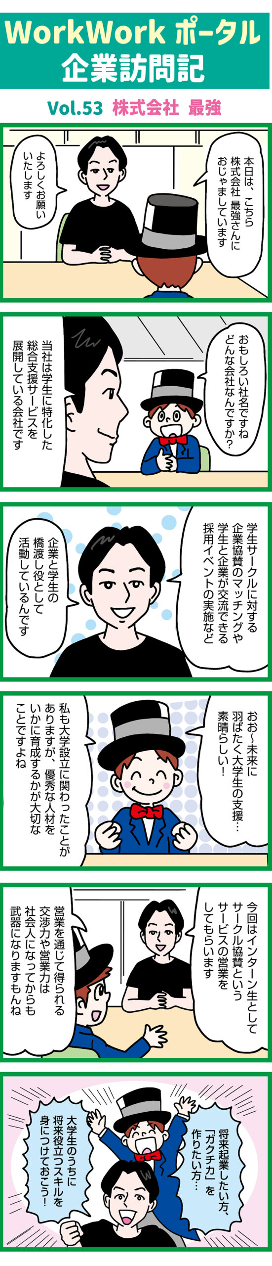 | \大学生のうちに、将来役立つ営業のスキルを身につけませんか?/ 株式会社最強では、学生支援事業を行っています。サークル活動資金のないサークルさんに協賛金によっての課題解決の提案をしています。 当社が大事にしていることは、チャレンジ精神です。これまでも多くのチャレンジをすることで、ここまで成長してきました。 これまで参加したインターン生も、当社のインターンを通じて大きく成長し、全くの未経験から、最終的には外資コンサルや外資投資銀行、国内大手IT企業など様々な企業の内定を獲得しています。 提案営業は決して簡単ではありませんが、その分、得られる経験も大きいです。先輩社員も全力でサポートするので、一緒にたくさんのチャレンジをしていきましょう。 ┈┈┈┈┈┈┈┈┈┈┈┈┈┈┈┈┈┈┈┈┈ 【対象となる人】 ■大学生、大学院生 【歓迎条件】 ・将来起業したい人 ・ガクチカを作りたい人 ・営業やマネジメントスキルをつけたい人 ┈┈┈┈┈┈┈┈┈┈┈┈┈┈┈┈┈┈┈┈┈ |